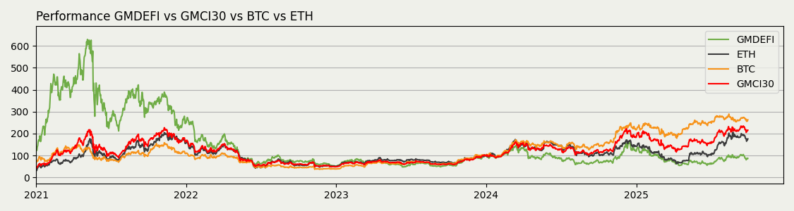 The GMCI DeFi contains the leading DeFi (Decentralized Finance) projects, spotlighting innovations that are revolutionizing finance through blockchain technology. This index targets the DeFi protocols demonstrating robustness, innovation, and influence in creating open, permissionless, and interoperable financial systems.Featuring projects at the forefront of decentralized lending, borrowing, trading, and more, the GMCI DeFi delivers insights into the protocols driving financial sovereignty and inclusion. As DeFi ecosystems expand, the GMCI DeFi serves as a crucial metric for the vibrancy, resilience, and evolution of finance on the blockchain, providing investors with a comprehensive guide to navigating this groundbreaking sector.