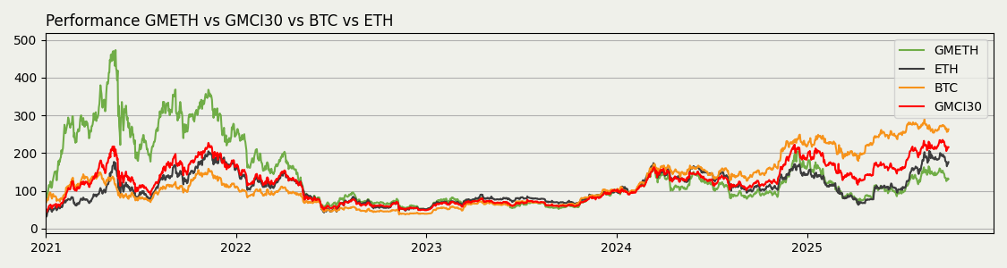 The GMCI Ethereum Select tracks the leading protocols and projects built on Ethereum, showcasing the innovative initiatives that harness the blockchain's high-performance infrastructure to revolutionize decentralized applications. This index focuses on projects demonstrating technical excellence, community engagement, and significant impact within the Ethereum ecosystem, from DeFi protocols and meme tokens to infrastructure solutions and decentralized applications. Featuring projects at the forefront of Ethereum's technological advancement, the GMCI Ethereum Select delivers insights into the protocols driving ecosystem growth and adoption.